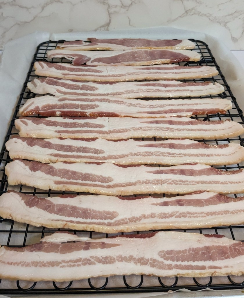 Lay each strip of bacon out on the rack.